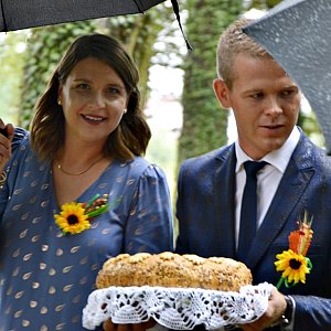 Starostami tegorocznych dożynek byli Natalia i Przemysław Tryler z Radwanic. - Po raz pierwszy pełnimy taką funkcję na dożynkach. To dla nas duże wyróżnienie, ale też pozytywny obowiązek. Jak korowód poprowadzony i chleb rozdany, to już same przyjemności zostały - śmieje się pani Natalia. Starostę pytaliśmy o tegoroczne zbiory: - Prowadzę gospodarstwo około 100 ha. Uprawiamy pszenicę, żyto, rzepak, jęczmień. Dziadek był rolnikiem, tato również, a teraz ja zajmuję się gospodarką. W tym roku uderzyła nas susza wiosenna, ale mimo wszystko te plony były okazałe. Cała sytuacja na świecie, sytuacja polityczna i zdrowotna, to wszystko rzutuje na gospodarkę i trzeba być elastycznym - wyjaśnia.